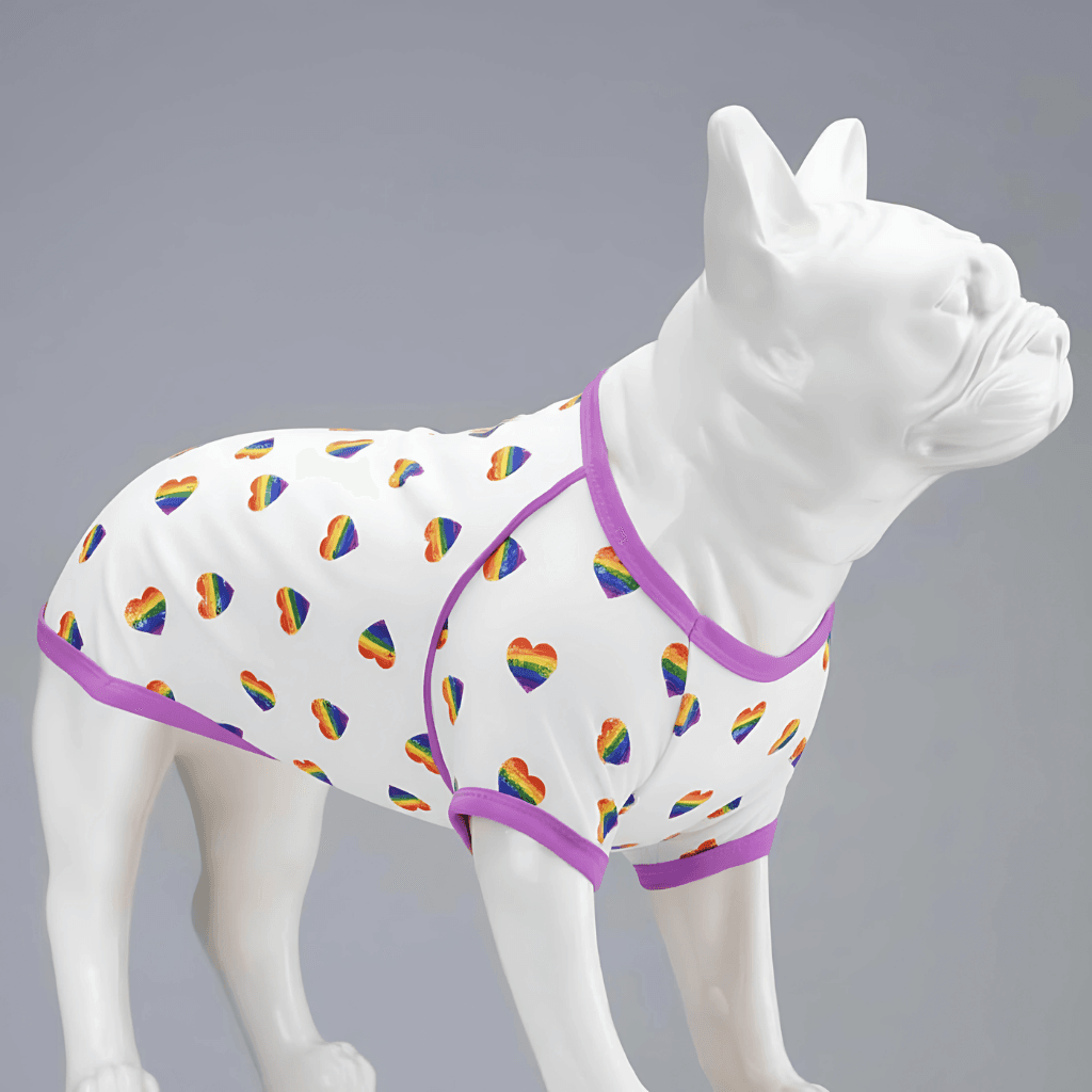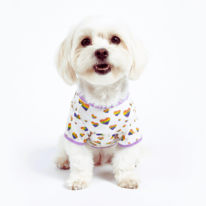 With its vibrant rainbow heart pattern, this tee is more than just apparel—it’s a joyful statement of love, positivity, and togetherness. Whether strolling through the park or joining family gatherings, your pup will radiate happiness and embody the universality of love.